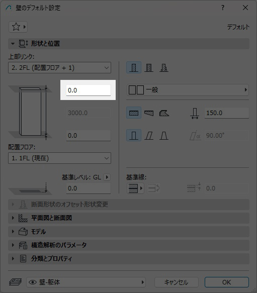 壁の上部リンクされたフロアまでのオフセット